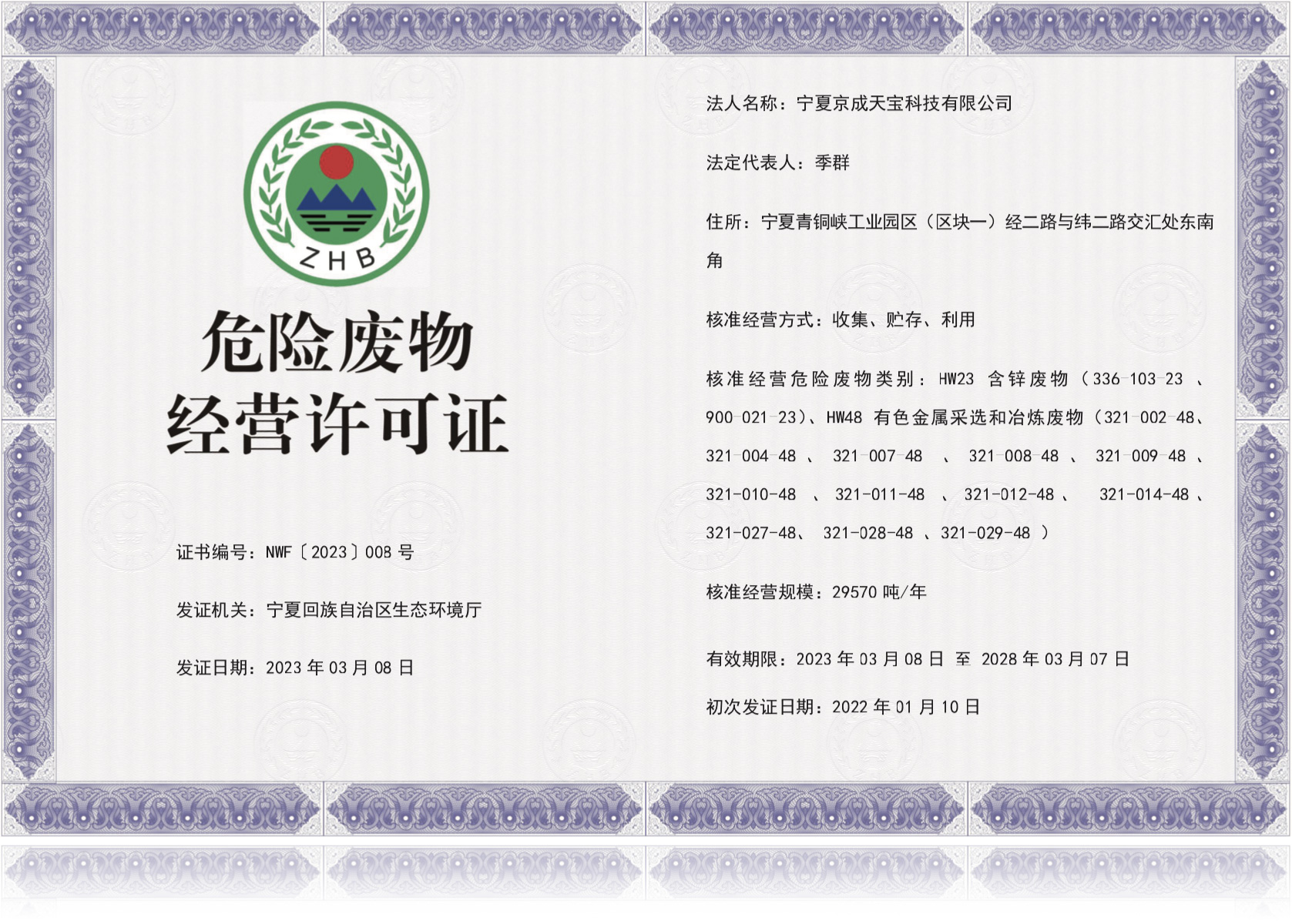 核準(zhǔn)經(jīng)營危險(xiǎn)廢物類別:HW23含鋅廢物(336-103-23、900-021-23)、HW48有色金屬采選和冶煉廢物(321-002-48、321-004-48、321-007-48、321-008-48、321-009-48、321-010-48、321-011-48、321-012-48、321-014-48、321-027-48、321-028-48、321-029-48)
